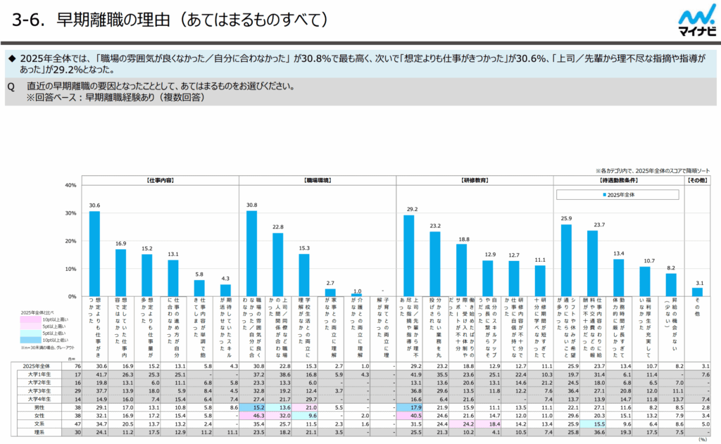 2025年全体では、「職場の雰囲気が良くなかった/自分に合わなかった」 が30.8%で最も高く、次いで「想定よりも仕事がきつかった」が30.6%、「上司/先輩から理不尽な指摘や指導があった」が29.2%となりました。